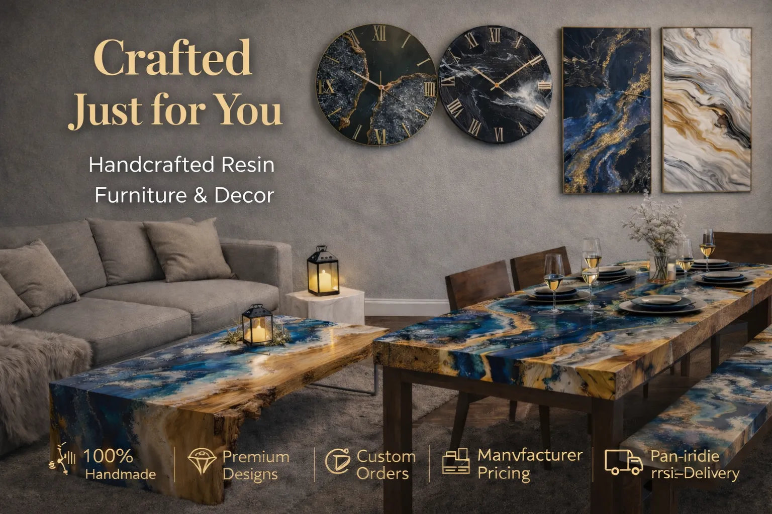 Handcrafted Resin wall clocks, Resin dining tables, Resin coffee tables, & Resin décor—crafted with precision and premium detailing.